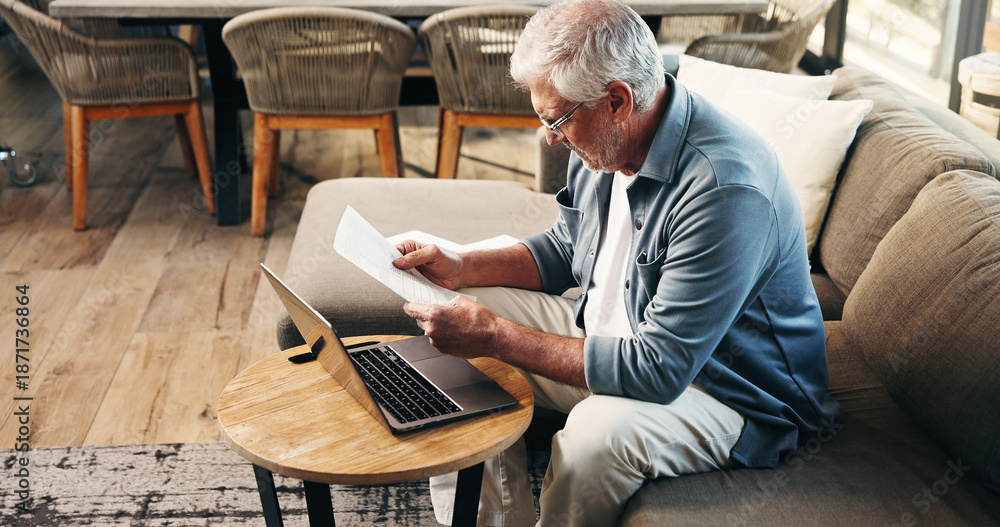 >Fototapety na wymiar>Wybrane motywy - zobacz więcej !>Spa & Beauty>Documents, laptop and senior man on sofa in home planning for retirement fund with savings. Paperwork, computer and elderly male person with finance budget for pension account in living room.