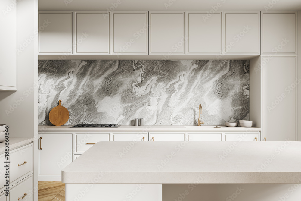 Fototapeta na wymiar - Modern interior kitchen with marble backsplash and white cabinets in minimalist design style on bright background. 3D Rendering.