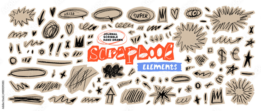 Fototapeta na wymiar - Retro scrapbook doodle scribble stickers set. Crayon drawn decorative collage shapes, torn paper edges. Scrapbook shapes for notes, journal, zine design. Daily planner and dairy craft stickers..