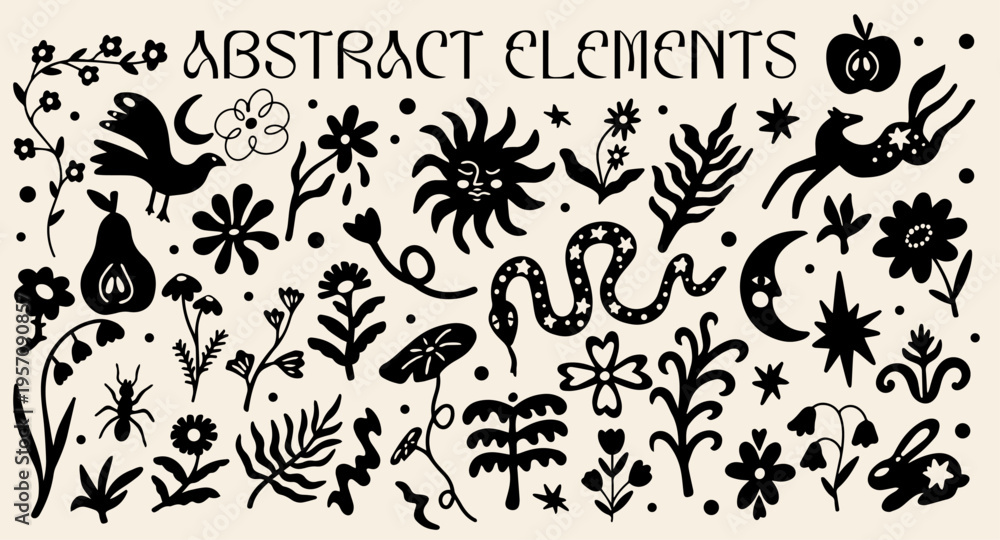 Fototapeta na wymiar - Abstract boho shapes design elements set with vector illustration of different types of magical animals, exotic flowers, funky plants, whimsical silhouettes, decorative stickers in boho aesthetic.