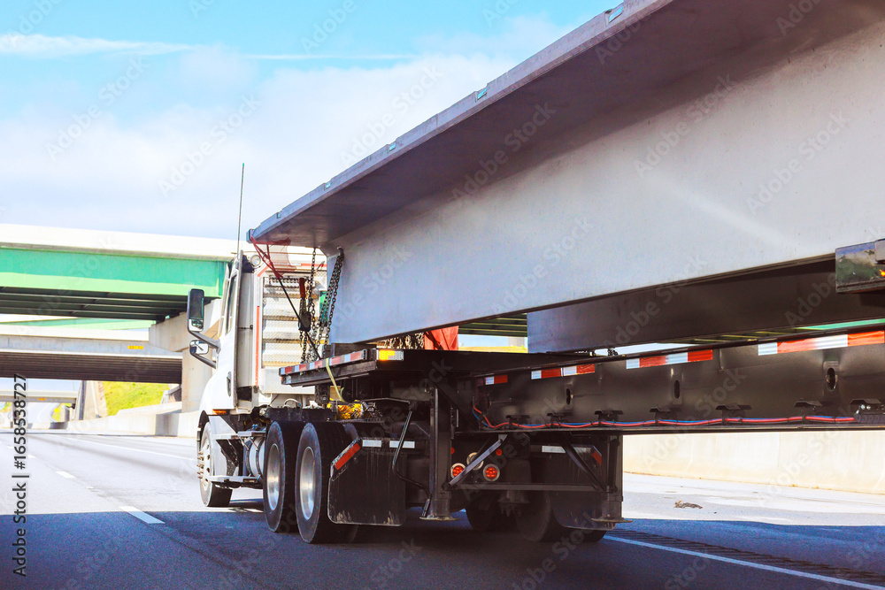 Fototapeta na wymiar - Heavy truck transports large concrete beam on busy highway during bright daylight near an overpass.