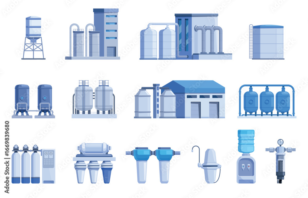 Fototapeta na wymiar - Water purification industry. Factories and filtration aqua engineering system. Cleaning water process, purifying liquids for drink and use, industrial sapid vector icons.