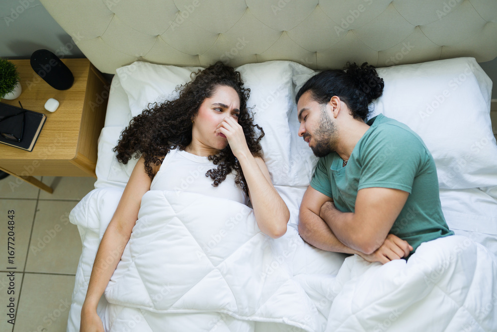 Fototapeta na wymiar - Woman pinching her nose because of bad breath from her partner sleeping in bed.