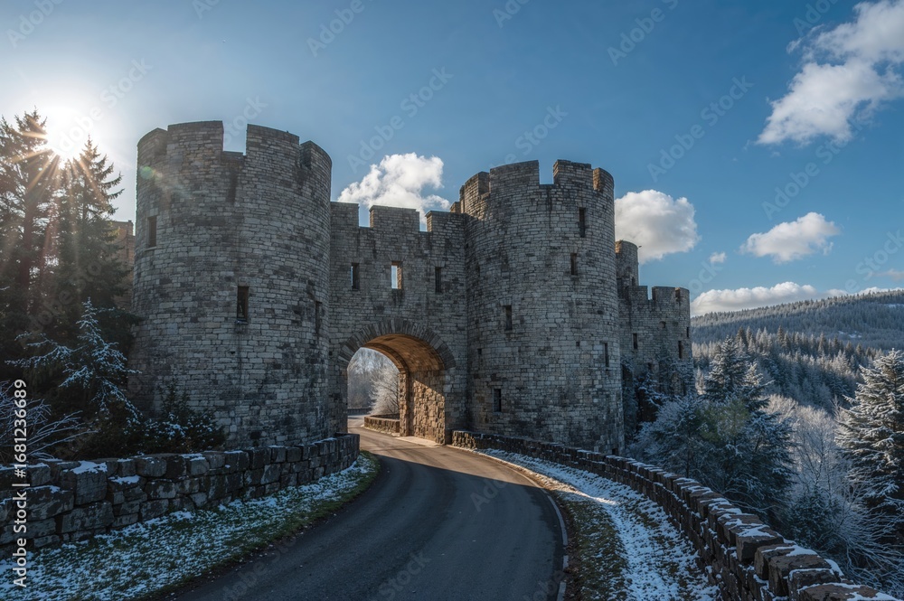 Fototapeta na wymiar - Ancient fortress gateway framed by icy dawn light.