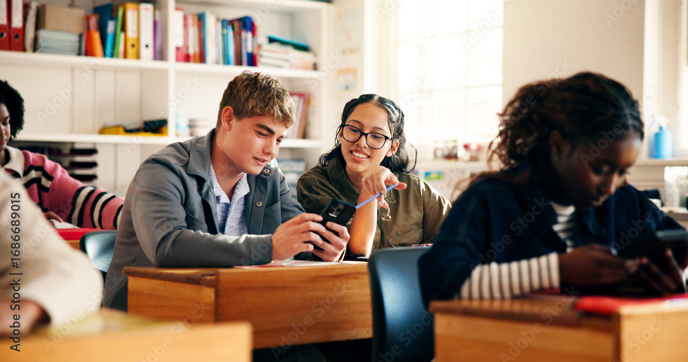 >Fototapety na wymiar>Wybrane motywy - zobacz więcej !>Sport>Learning, students or friends with phone in classroom for research, online course or smile. Teenager, boy and girl with mobile for education assignment, scholarship or chat for high school curriculum