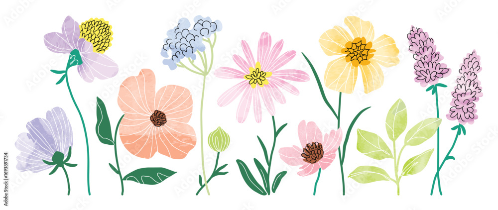 >Fototapety na wymiar>Wybrane motywy - zobacz więcej !>Sport>Flower elements vector set. Collection colorful floral of wildflower, leaf branch, foliage with watercolor texture. Hand drawn blossom illustration for decor, easter, thanksgiving, clipart.