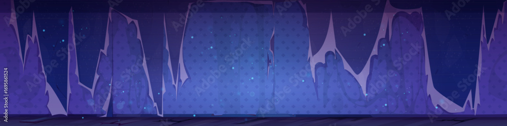 Fototapeta na wymiar - Night scene with torn wallpaper on abandoned wall - broken purple paper edges on dark surface, glowing particles and mystical atmosphere. Damaged interior bg for horror or mystery game environments..