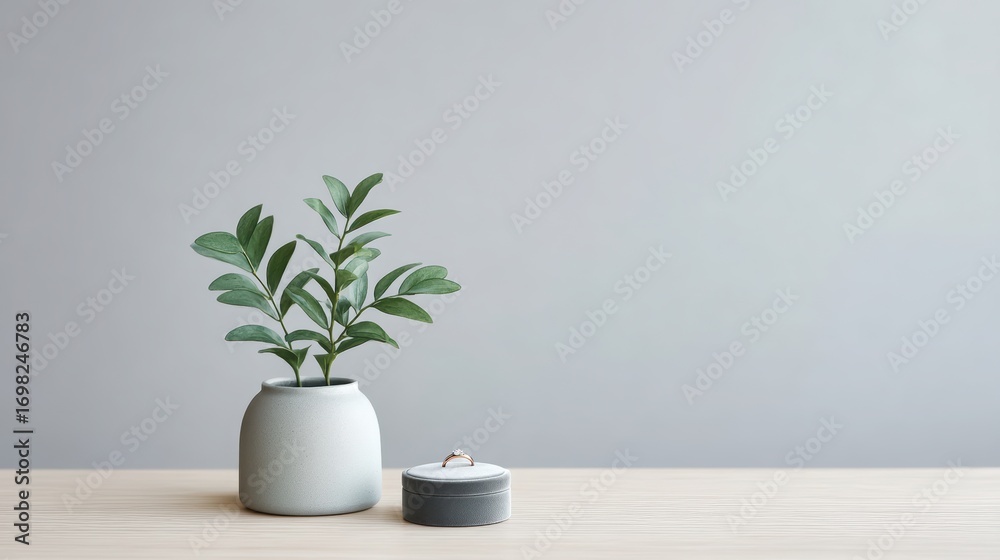 Fototapeta na wymiar - weekday wedding vibes A minimalist arrangement featuring a plant in a gray pot against a simple backdrop..