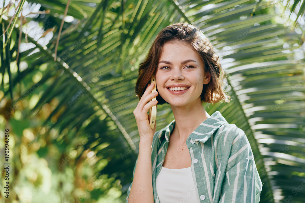 Fototapeta na wymiar - woman, portrait, smile, outdoors, phone call, casual clothes, green foliage, sunny day, cheerful mood, friendly gesture, natural light, candid moment, relaxed vibe, warm surroundings, bright.