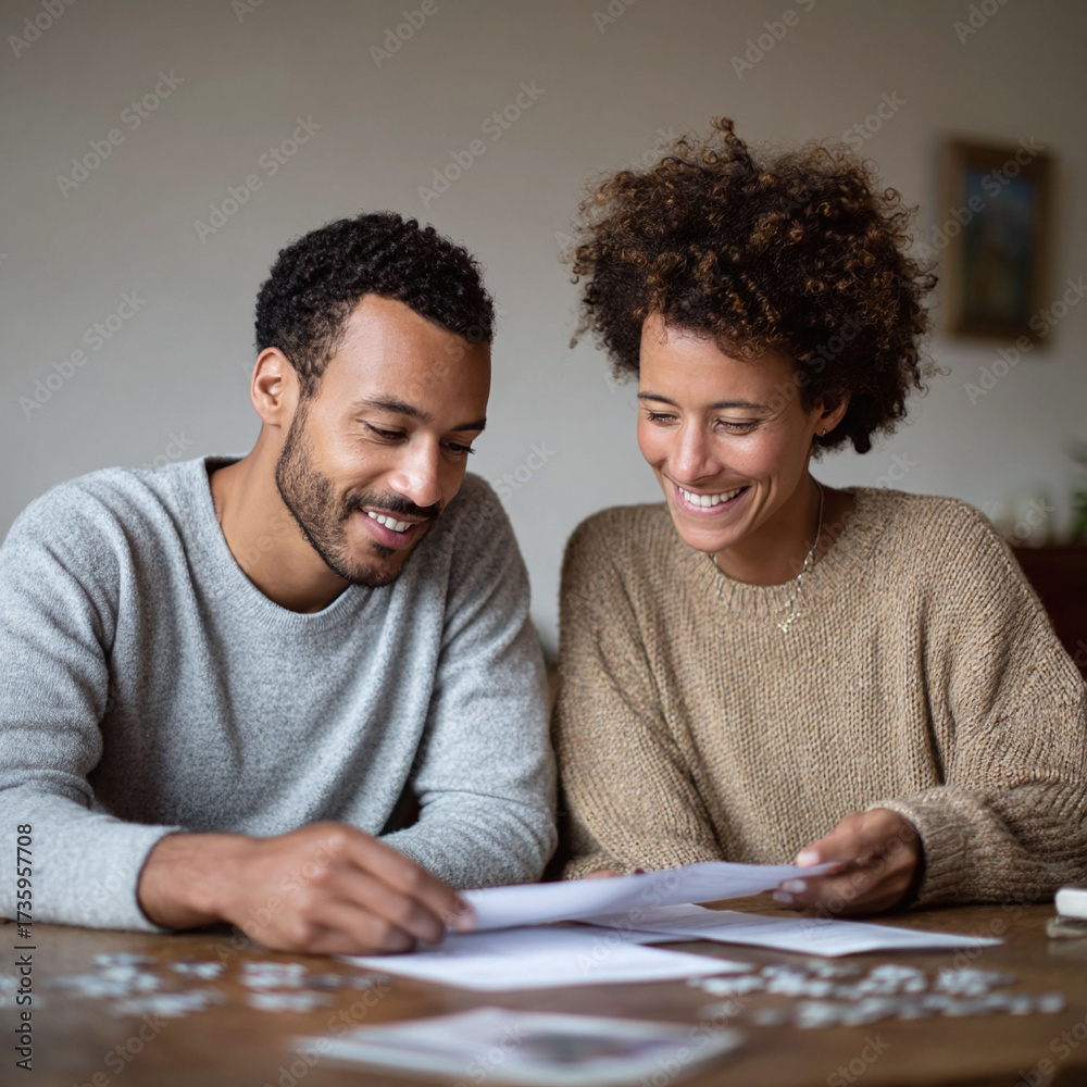 Fototapeta na wymiar - Happy couple reviewing documents together at home. Represents partnership, finance, or shared goals. Perfect for illustrating financial planning, relationships, or family life..