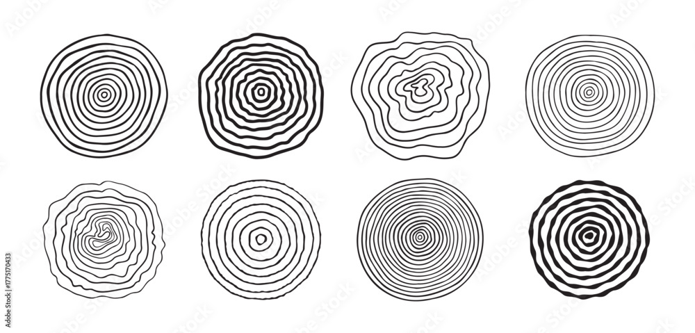 Fototapeta na wymiar - tree rings background and saw cut tree trunk icon doodle hand drawn. Outline wood circle line drawing clipart symbol.