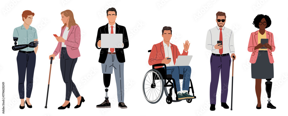 >Fototapety na wymiar>Wybrane motywy - zobacz więcej !>Sport>Diverse business people with disabilities, including prosthetics, wheelchair users, and mobility aids, representing modern inclusive workplace and accessibility concepts. Vector illustration isolated