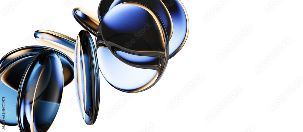 Fototapeta na wymiar - Abstract black 3d background with neon glass circle discs, radiant blue gold gradient and circular motion effect. Holographic transparent round disks or lens. Futuristic tech banner.