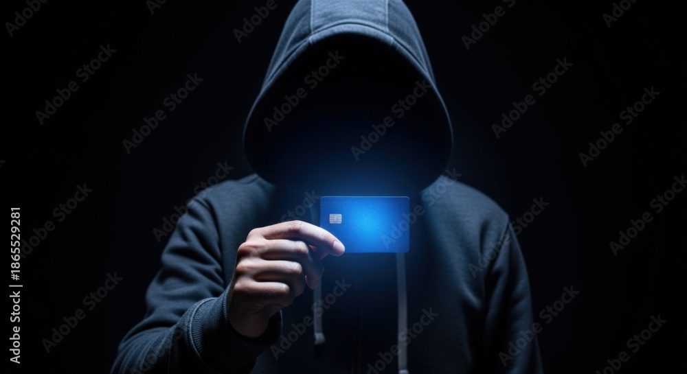 Fototapeta na wymiar - Anonymous hooded figure holding a blue credit card, representing financial cybercrime and digital security threats.