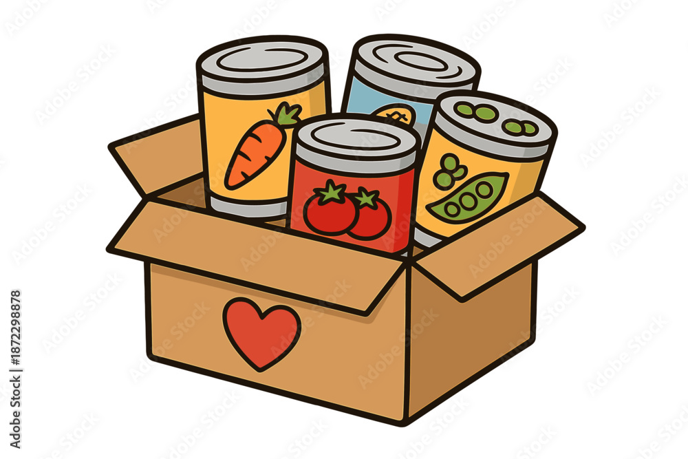 Fototapeta na wymiar - Food donation box with canned goods for community support in a local charity event.