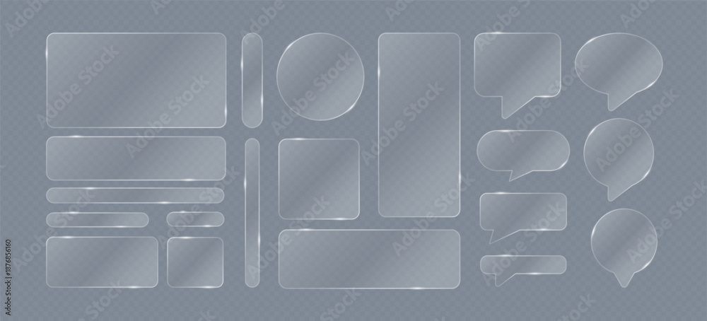 Fototapeta na wymiar - Glassmorphism frames. Transparent glass elements. Simple UI UX glass texture border with geometric shapes, blur, round edges, reflections for interface. Vector set.
