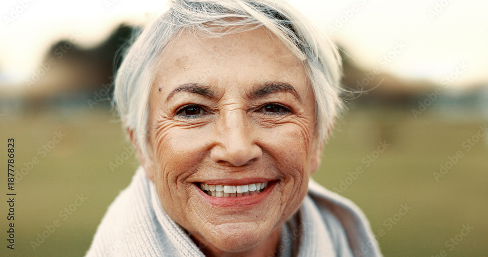 >Fototapety na wymiar>Wybrane motywy - zobacz więcej !>Sport>Face, senior woman and smile in nature on vacation, holiday or travel in winter. Portrait, happy and elderly person in the countryside, park or garden for wellness, freedom or retirement in Canada