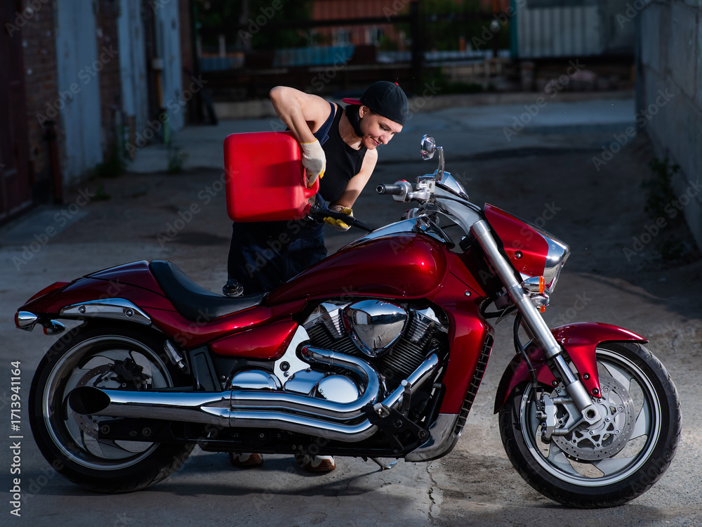 Naklejka na ściany i meble - Caucasian woman refueling motorcycle from canister. .