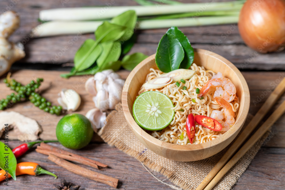 Naklejka na ściany i meble - Close-up shot Instant noodles with lemon shrimp chilli hot and spicy on old wooden table select focus shallow depth of field.