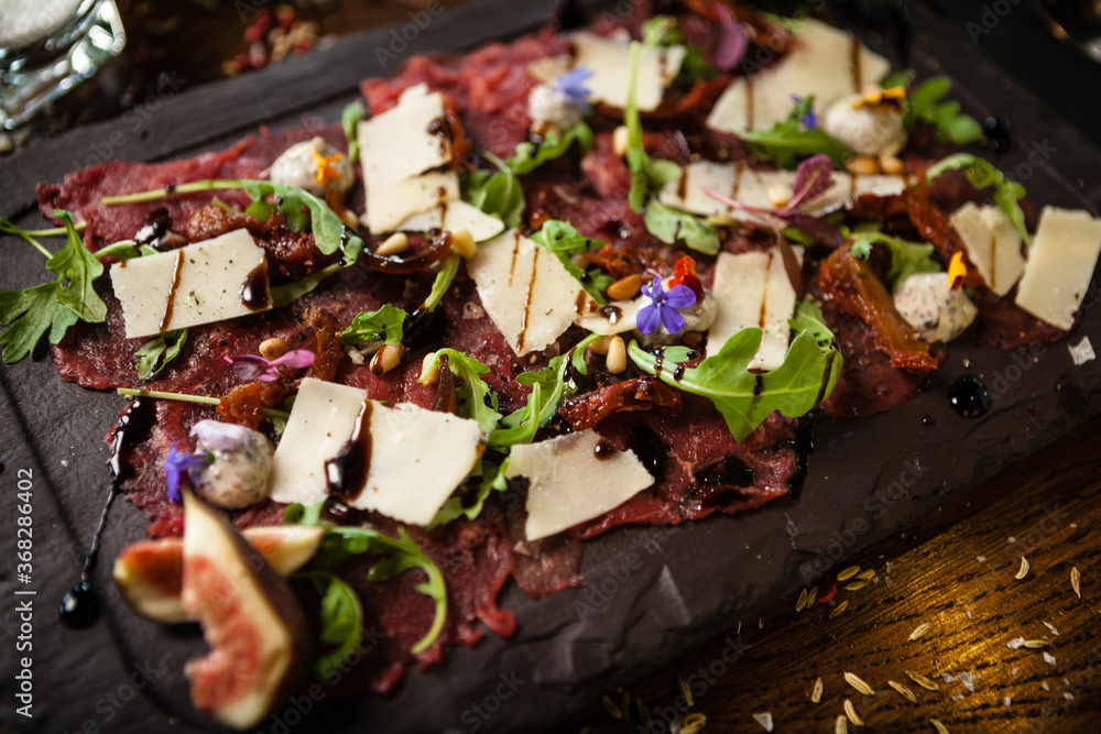 >Naklejki na ściany i meble>Beef carpaccio with pepper, rucola and parmesan served on a board. Delicious healthy Italian traditional antipasti snacks food closeup served for lunch with wine in modern gourmet cuisine restaurant