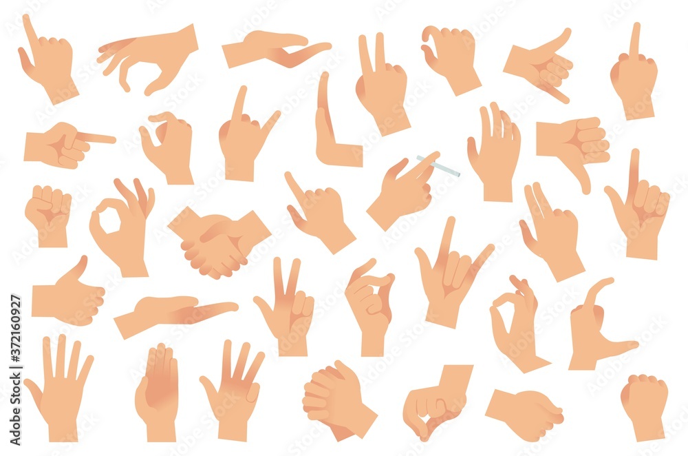 Naklejka na ściany i meble - Hand gestures. Various arms, human hands, ok, thumb up and pointing finger, pinch and fist. Optimistic or pessimistic arm gesture, interactive communication vector isolated set.