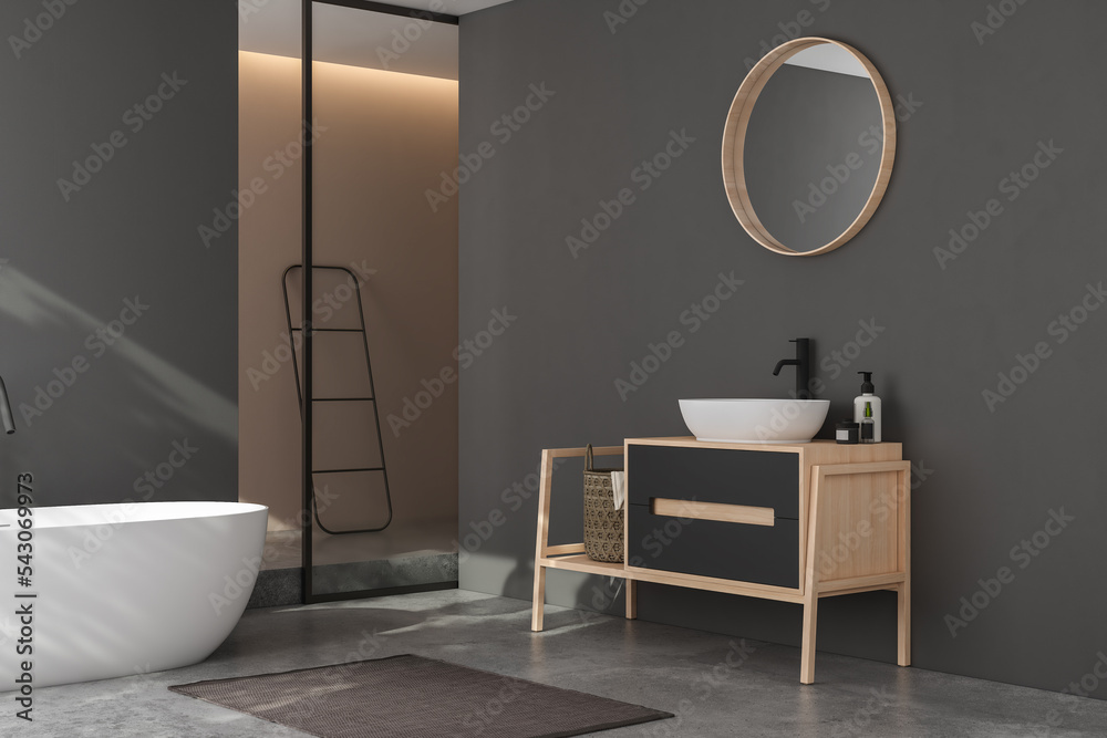 Naklejka na ściany i meble - Modern minimalist bathroom interior, modern bathroom cabinet, white sink, wooden vanity, interior plants, bathroom accessories, bathtub and shower, black and beige walls, concrete floor. 3d rendering.