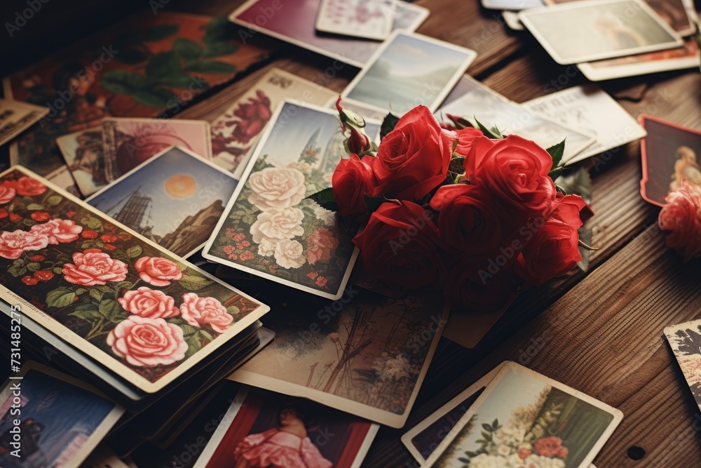 Naklejka na ściany i meble - A stunning bouquet of roses adorns a simple wooden table, creating a natural and elegant centerpiece, Vintage Valentine's Day postcards scattered on a wooden table, AI Generated.
