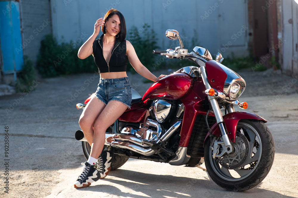 Naklejka na ściany i meble - Brunette woman in shorts posing on a red motorcycle. .