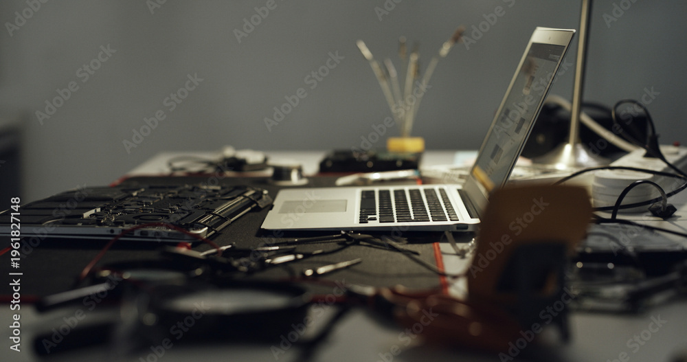 Naklejka na ściany i meble - Laptop, repair and work desk with components for electronic maintenance or fix in workshop. Empty, computer or IT engineering with equipment for problem solving, troubleshooting or circuit testing.