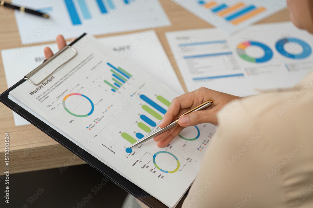 Naklejka na ściany i meble - Budget Analysis. Professional reviewing monthly financial reports in a meeting..