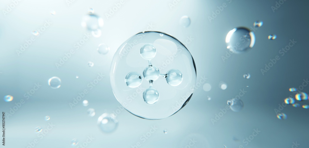 Naklejka na ściany i meble - Clean skincare concept of transparent serum molecule floating in liquid. Visualization of hydration, active ingredients delivery, skin balance and advanced cosmetic science technology..