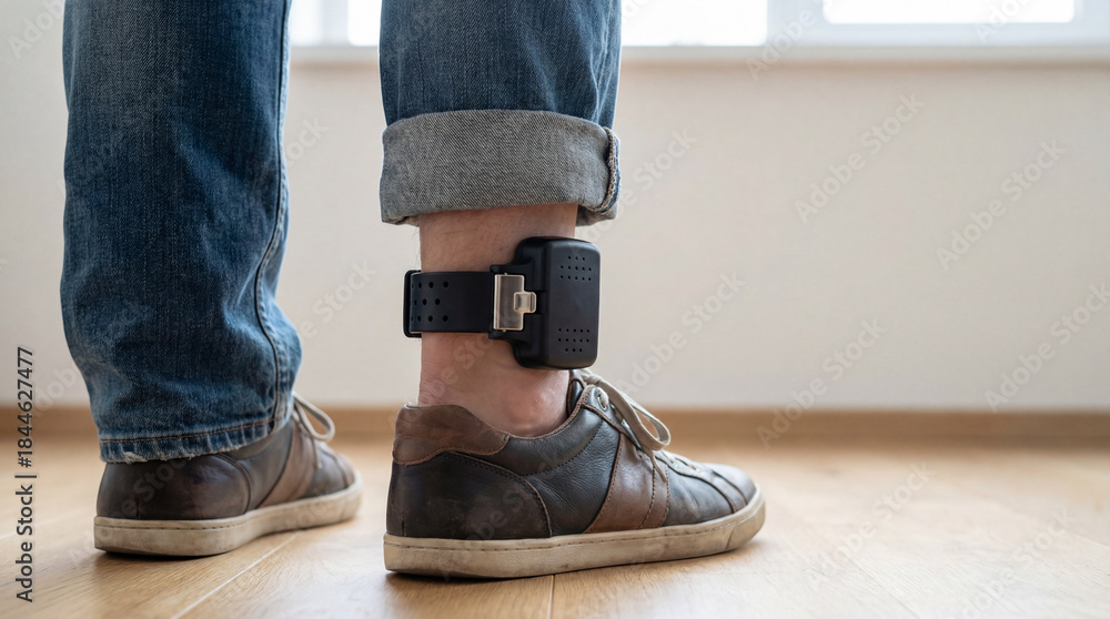 Naklejka na ściany i meble - Man wearing electronic ankle monitor in home interior, close up of monitoring device on leg with rolled up jeans and casual shoes.