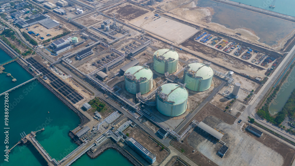 Naklejka na ściany i meble - Massive LNG storage tank facility at an industrial coastal terminal. Global natural gas energy logistics, liquid fuel cargo container supply chain, and petroleum distribution trade concept..