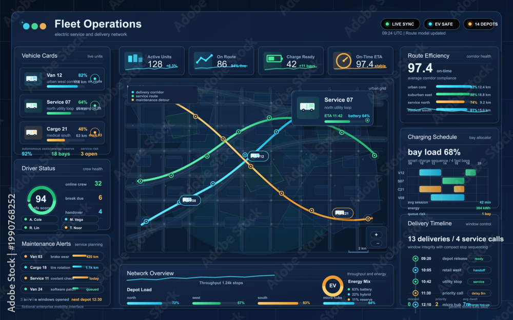 Naklejka na ściany i meble - Futuristic fleet operations dashboard interface with electric vehicle routes, charging schedule, delivery timeline, and maintenance alerts..