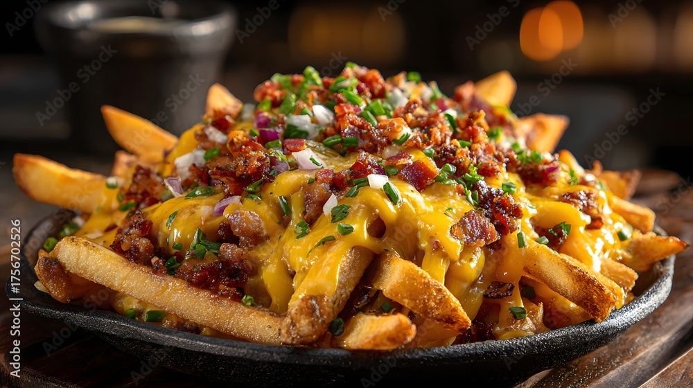 Naklejka na ściany i meble - Loaded french fries with melted cheese and bacon bits..