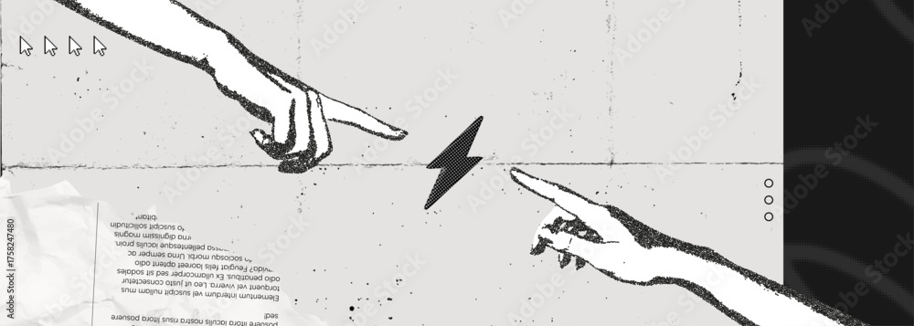 Naklejka na ściany i meble - Trendy Stipple Halftone effect Two hands pointing to lightning bolt. Power of teamwork. Digital contemporary art. SEO marketing concept. Business idea. Vintage vector illustration art.