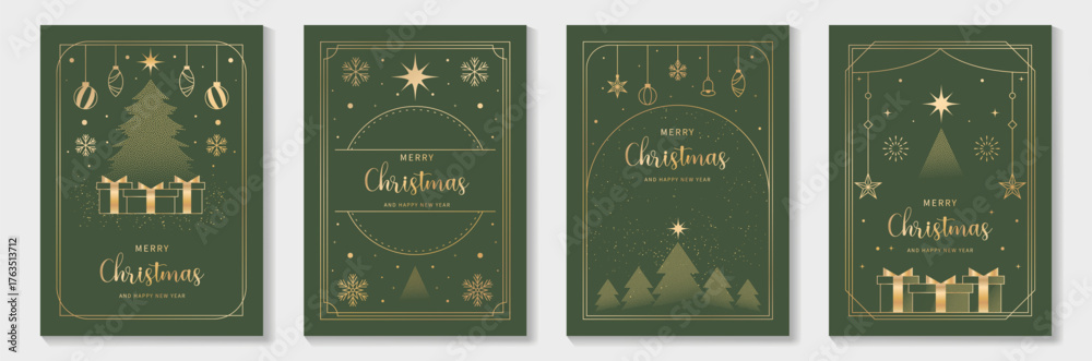 Naklejka na ściany i meble - Elegant Merry Christmas and Happy New Year greeting card vector set with gold line art decorations, green background, holiday frames for celebration .