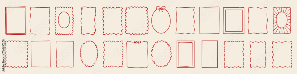 Naklejka na ściany i meble - Collection of 24 red hand drawn frames in various shapes: rectangles, ovals, scalloped and wavy borders. Minimal doodle style perfect for Christmas cards, invitations, and gift tags.