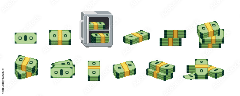 Naklejka na ściany i meble - Pixel art of money set. Green banknotes in 8bit style. Wads, piles of bank notes for old 8 bit video games. Dollar bills, cash for computer videogames. Flat isolated vector illustrations on white.