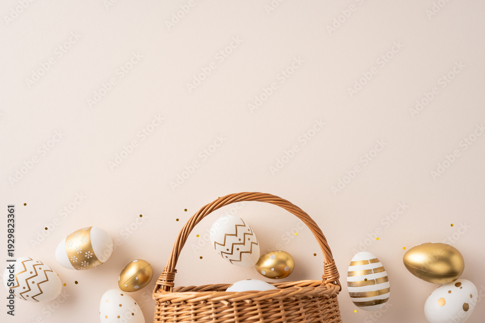 Naklejka na ściany i meble - Happy Easter celebration and greeting featuring white and gold decorated eggs in a wicker basket with confetti for a festive and elegant seasonal decoration.