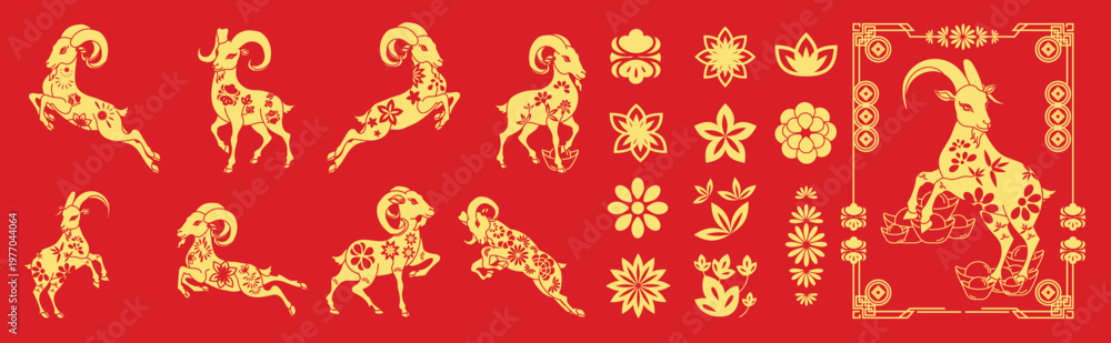 Naklejka na ściany i meble - Happy Chinese New Year 2027 goat vector set. Red and gold zodiac animal collection with ornamental frames, lantern, flowers, firecrackers and festive Chinese decorative elements..