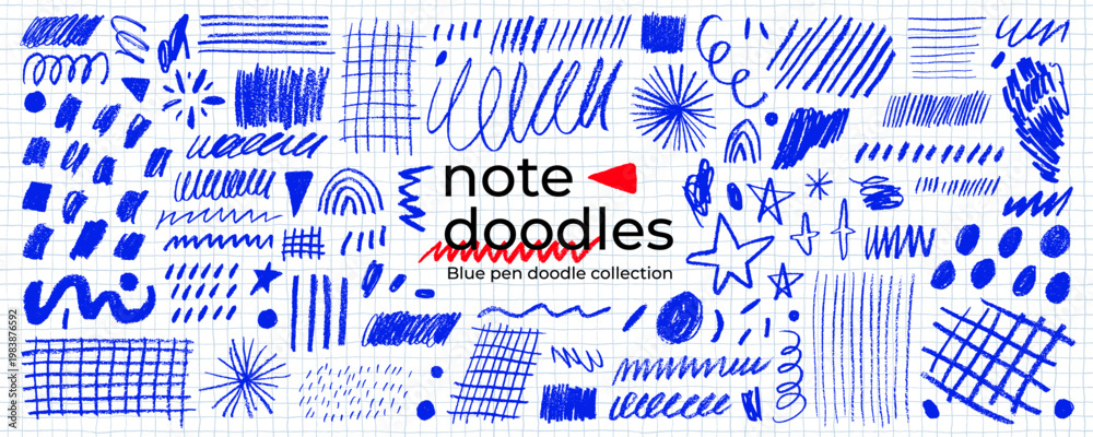 Naklejka na ściany i meble - Blue ball pen scribble, squiggle and note doodle collection. Hand drawn blue pen grids, straight strokes, squiggly underlines, and star shapes. Notebook and journal doodle scribble for school design..