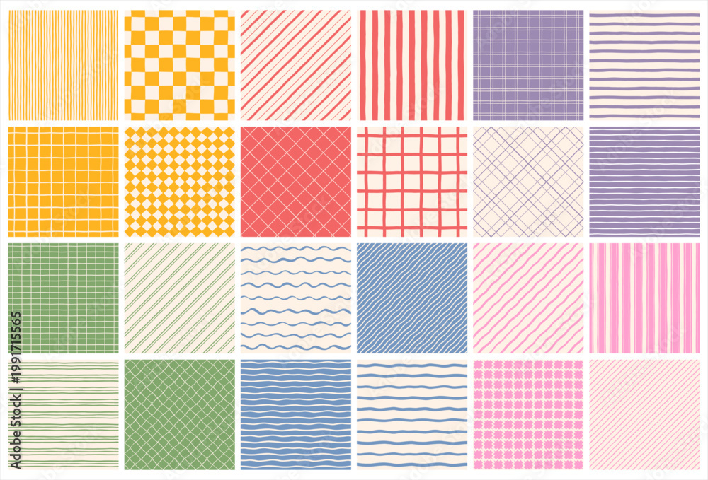 Naklejka na ściany i meble - Hand drawn geometric striped grid checkered seamless regular patterns big set. Doodle uneven artistic lines, diagonal wavy pinstripes stripes bars streaks waves. Check chess plaid square backgrounds.