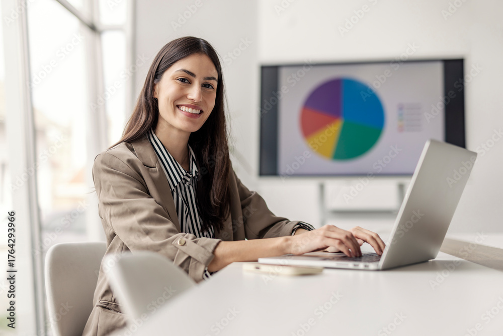 Naklejka na ściany i meble - Confident Businesswoman in Tan Blazer Typing on Laptop in Modern Office.