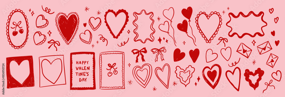 Naklejka na ściany i meble - Love and Valentine's Day large collection of trendy hand drawn doodle decorative elements, hearts, frames, love letters, heart shaped balloons, bows and stars. Symbols of Valentine's Day and love..