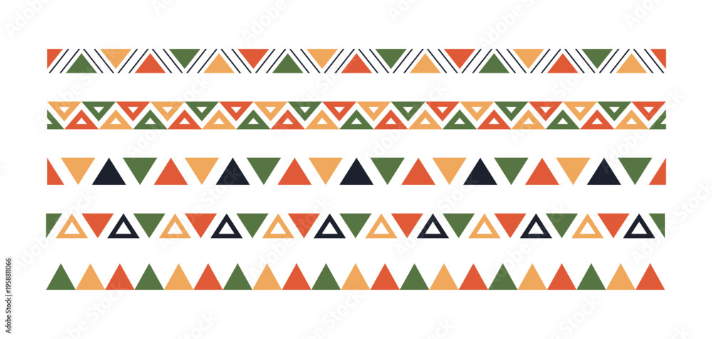 Naklejka na ściany i meble - Mexican pattern line border. African ethnic motif border. Aztec triangular ornament line stripe. Mexican or African ethnic culture ornament. Vector illustration isolated on white background..