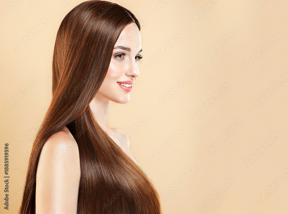 Naklejka na ściany i meble - Beautiful model girl with shiny brown and straight long hair . Keratin straightening . Treatment, care and spa procedures. Smooth hairstyle. .