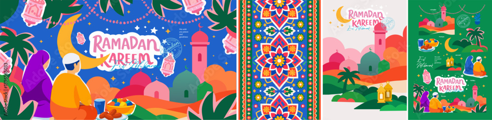 Naklejka na ściany i meble - Ramadan Kareem. Vector bright modern illustration of a Muslim family, mosque, lanterns, celebration, crescent moon, iftar food, and an ornamental pattern for Islamic greeting card, poster, banner, bac.