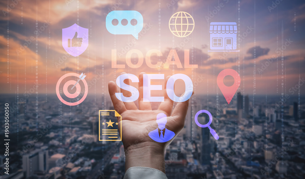 Naklejka na ściany i meble - A hand extends towards translucent icons representing local SEO concepts over a city skyline at sunset, illustrating the fusion of digital marketing with urban landscapes. Gantry.