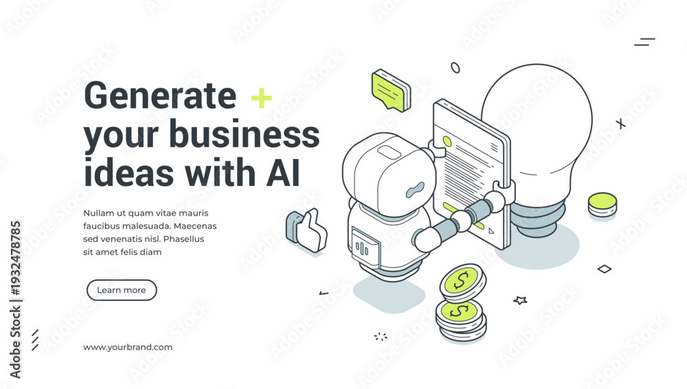 Naklejka na ściany i meble - Generate business ideas with AI isometric banner. Robot for creative solution and startup. Modern web template vector illustration for business strategy and artificial intelligence.